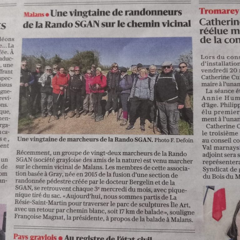 Article de l’Est républicain lors de la randonnée du 18 mars organisée par Jean-Marie. Pour les participants, rappelez-vous : on a croisé un couple dont la femme nous a pris en photo et interviewé. Elle a mal orthographié mon nom…mais à part cela, c’est toujours un peu de publicité pour le club.